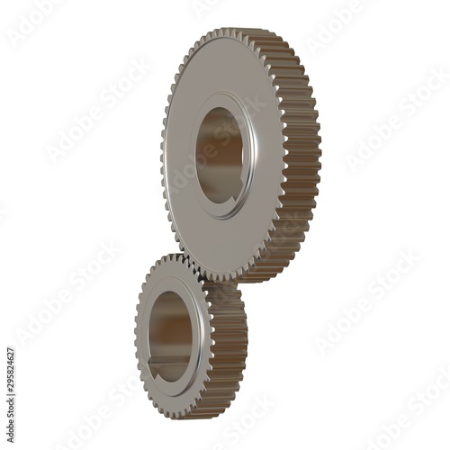 Two metal gears on a white background, isolate. 3D rendering of excellent quality in high resolution. It can be enlarged and used as a background or texture.