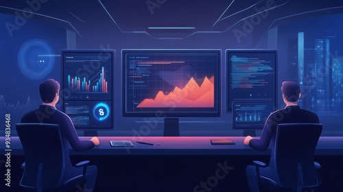 Two professionals analyzing data on multiple screens in a modern office environment, showcasing charts and analytics.