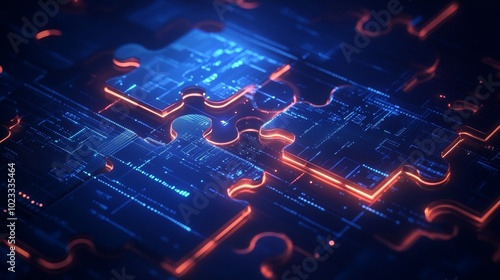 Two Puzzle Pieces Connected Representing AI and Business Integration in Data Center Management with Glowing Binary Code Background