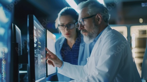 Two scientists analyzing data on computer screens in a modern laboratory.