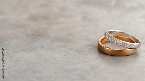 Two wedding rings, one gold and one silver with diamonds, resting on a textured surface.