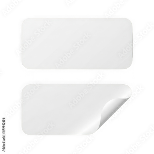 Two white rectangular stickers with rounded corners, one peeled back corner, isolated on transparent background