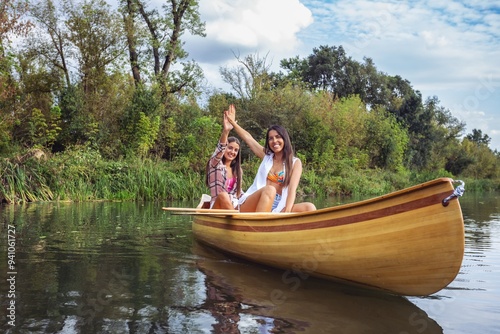 Two women enjoying a canoe ride down a scenic river.