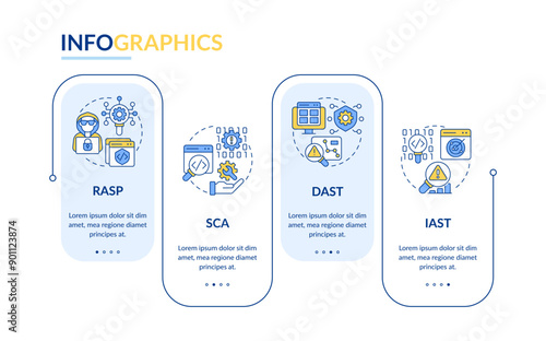 Types of application security tools rectangle infographic vector. Source code, debugging. Data visualization with 4 steps. Editable rectangular options chart. Lato-Bold, Regular fonts used