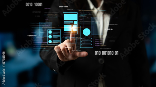 UI UX mockup showing application layout, structure, and code interface. UI design defines user flow, UI design improves clarity, UI design enhances experience, and UX design supports logic. Latch