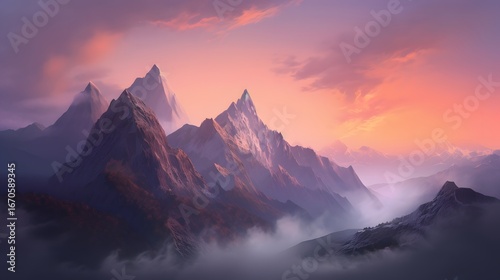 ultra realistic depiction of misty mountain ridge at dawn with misty slopes receding into atmospheric haze and serene mood sunrise over the mountains