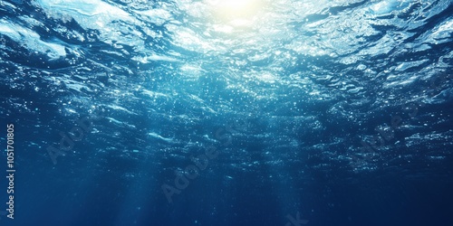 Underwater scene with sunlight, shimmering water surface, and bubbles