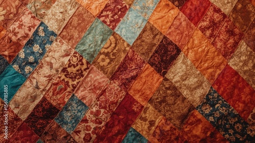 Unique texture of colorful patchwork quilt showcasing fabric patterns and warm autumn tones, perfect for cozy home decor, seasonal crafts, textile design inspiration, rustic background