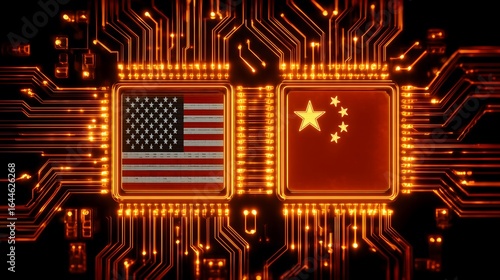 United States and China flags integrated into glowing microchips on a circuit board, symbolizing technology rivalry, semiconductor competition, and global tech dominance