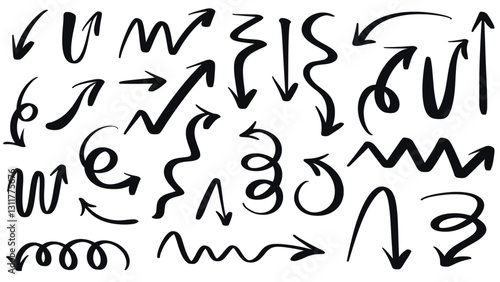 Universal arrows in doodle style set. Collection of ink arrows right, left, up, down, curved, circle and others. Hand drawn direction pointer icons, vector graphics