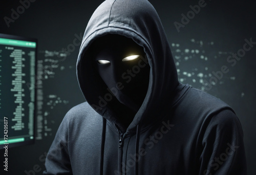 Unrecognizable computer hacker with hoodie and obscured face. Abstract technology, cyber security, cyber attack, personal data safety, internet fraud, data thief, darknet concept background