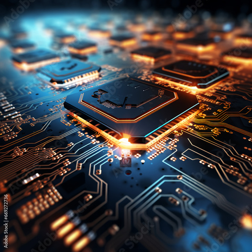 Up close image of computer micro electronics and computer chips on a lit up electronics board