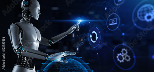 Update system upgrade install. Robot pressing button on screen 3d render.