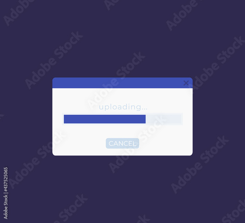 Upload window with progress bar, flat vector ui