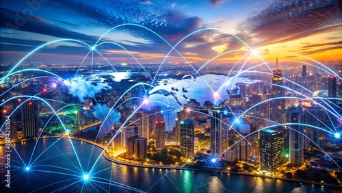 Urban Skyline Illuminated by Interconnected Light Streams, Reflecting a Global Network of Communication and Collaboration