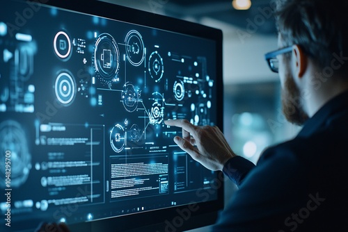 User interacting with a website prototype on a large touch screen, interactive design concept, user experience testing.