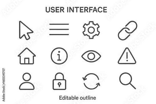 User interface line icon set. Essential UI and UX outline icons for web design, mobile app, and websites. Vector collection of minimal symbols for navigation and web development.