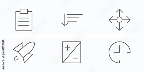 user interface outline icons set. thin line icons such as padnote, sort down, enlarge, rocket launch, brightness, hour vector.