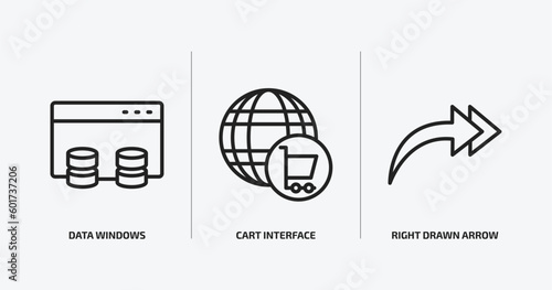 user interface outline icons set. user interface icons such as data windows, cart interface, right drawn arrow vector. can be used web and mobile.