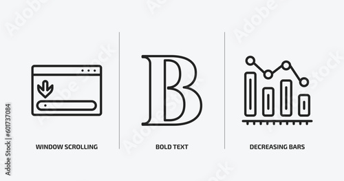 user interface outline icons set. user interface icons such as window scrolling right, bold text, decreasing bars chart vector. can be used web and mobile.