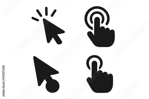 User interface solid glyph icon set. Click, tap, cursor, and touch symbols. Hand pointer and arrow for web design. Vector collection for UI and UX. Press button concept.