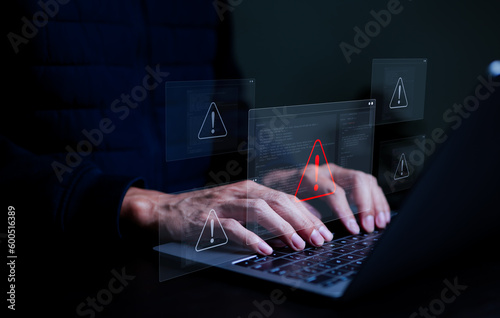 User or it staffs, programmer, developer using computer laptop with triangle caution warning sign for notification error and maintenance concept. Virus detected warning, Computer bugs, Software bug.