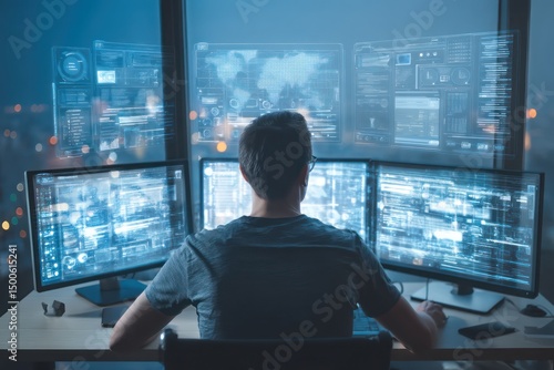 User surrounded by several computer screens, using digital tools for advanced task management and analysis.