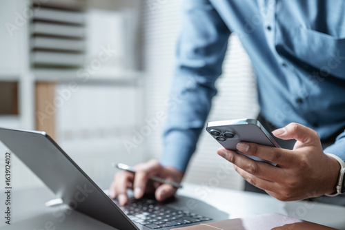Using smartphone social media concept. Mobile internet banking. Typing online community post, Chat, Comment. Online shopping payment. Artificial intelligence technology.