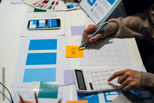UX developer and ui designer brainstorming about mobile app interface wireframe design with customer breif and color code, User experience concept..
