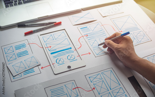 ux Graphic designer creative sketch planning application process development prototype wireframe for web mobile phone . User experience concept.