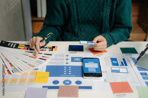 UX graphic designer planning application process development prototype wireframe for web smart phone.