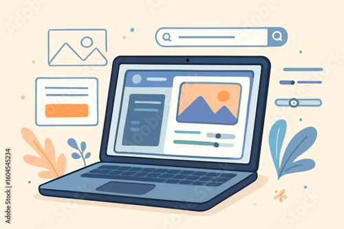 UX UI design and web development concept. Laptop with website interface creation process. User experience research and prototyping. Digital project and programming vector.
