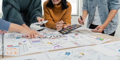 Ux Ui development team discussing meeting working together at working table in office