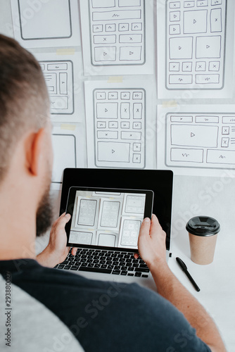UX website design wireframe. Sketch, prototype, framework, layout future design project. UI/UX - user interface, user experience designer. Creative concept for web design studio. Website development