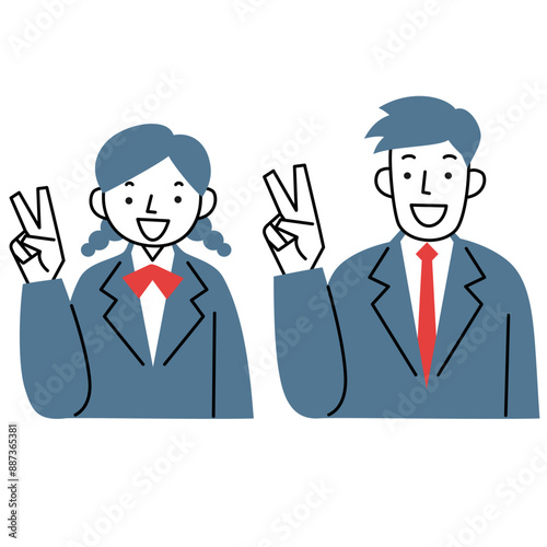 Vサインをする女子学生と男子学生の上半身セット