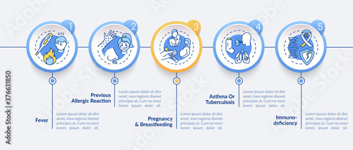 Vaccination contraindications and precautions vector infographic template. Presentation design elements. Data visualization with five steps. Process timeline chart. Workflow layout with linear icons