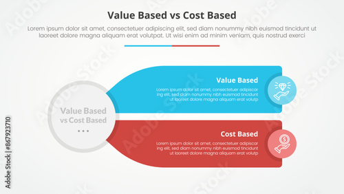 value based vs cost based comparison opposite infographic concept for slide presentation with big circle and long rectangle box description with flat style