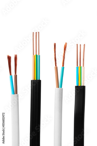 Various Electrical Wires With Exposed Copper Strands on White Background