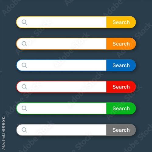 Various search bar templates. Internet browser engine with search box, address bar and text field. UI design, website interface element with web icons and push button. Vector illustration