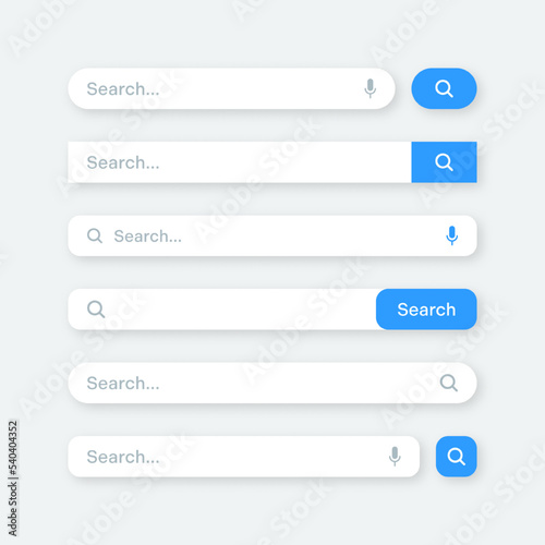 Various search bar templates. Internet browser engine with search box, address bar and text field. UI design, website interface element with web icons and push button. Vector illustration