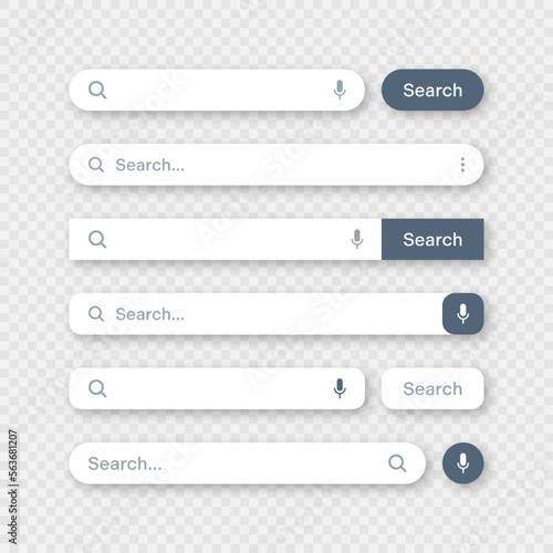Various search bar templates. Internet browser engine with search box, address bar and text field. UI design, website interface element with web icons and push button. Vector illustration