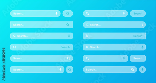 Various transparent search bar templates. Internet browser engine with search box, address bar and text field. UI design, website interface element with web icons and push button. Vector illustration