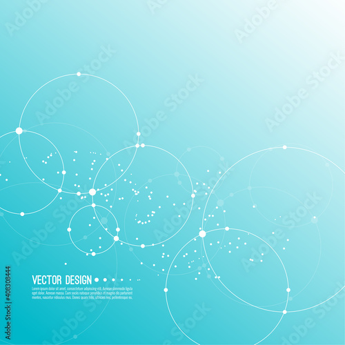 Vector abstract background with overlapping circles and dots. Chaotic motion. Round banner with empty space for text. Node molecule structure. Science and connection concept.