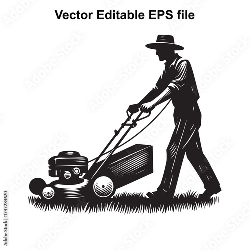 Vector art of silhouette of a man mowing the lawn with a push mower