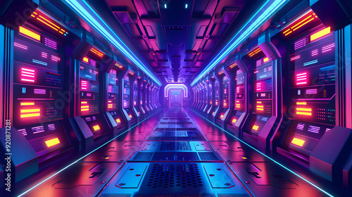 Vector cartoon corridor in a spaceship,Data Center With Illuminated Server Racks