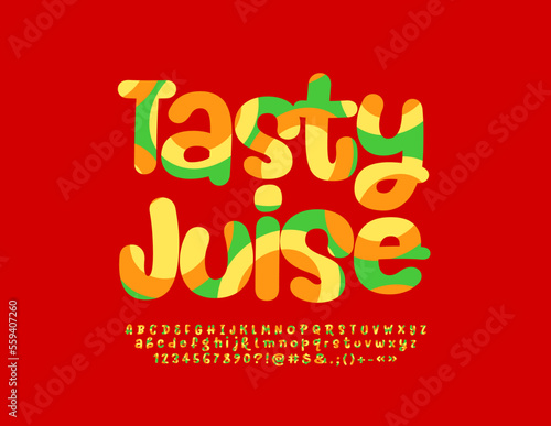 Vector colorful bannerTasty Juice. Funny handwritten Font. Set of creative Alphabet Letters and Numbers
