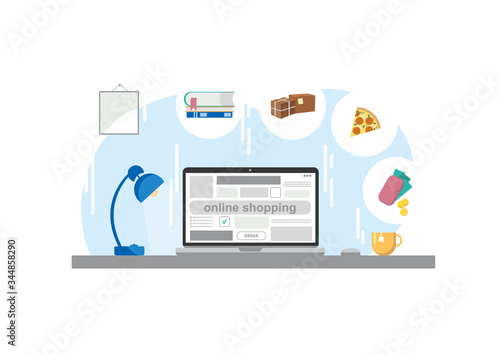 Vector conceptual illustration of online shopping. A laptop with an inscription on the screen and various icons of goods and services nearby