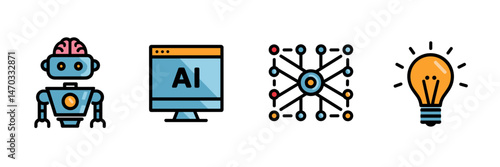 Vector icon set featuring AI robot, brain computer, neural network diagram, and light bulb