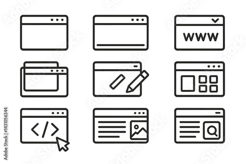 Vector icon set representing various web browser functionalities and design elements for digital applications