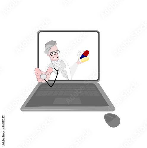 Vector illustration doctor and drug and computer on isolate white background.Online medical consultation concept.